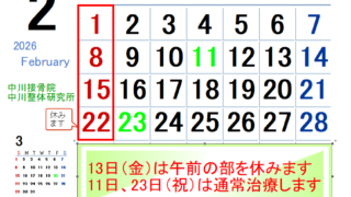 早いもので年が明けてもう一ヶ月になろうとしています2月の休みも日曜日のみですまた、13日(金)は午前は休みます午後の受付は4時半からとなります元気に施術していますので、お気軽にご相談ください