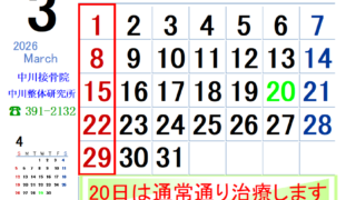 2月はあっという間に最終週です3月も20日(金祝)は通常通りに施術します尚、月末月初め2月25日(水)、27日(金)、3月2日(月)の午後の受付は5時半とさせていただきます午前の施術は9時から13時までやっています