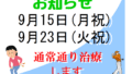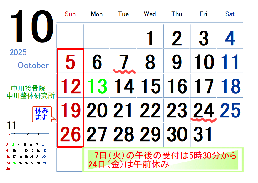 10月は施術時間の変更が有りますのでご注意ください